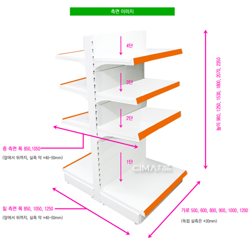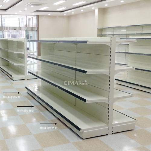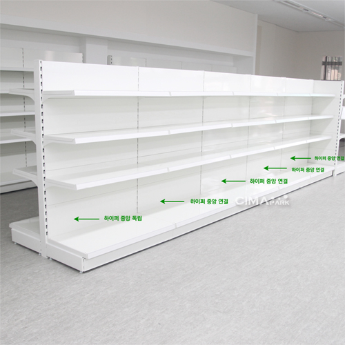 특이사항:하이퍼 중앙 진열대는 보통 매장내 중앙에 위치하며 선반이 양쪽 타입이며 단독 설치 가능한 독립형입니다.